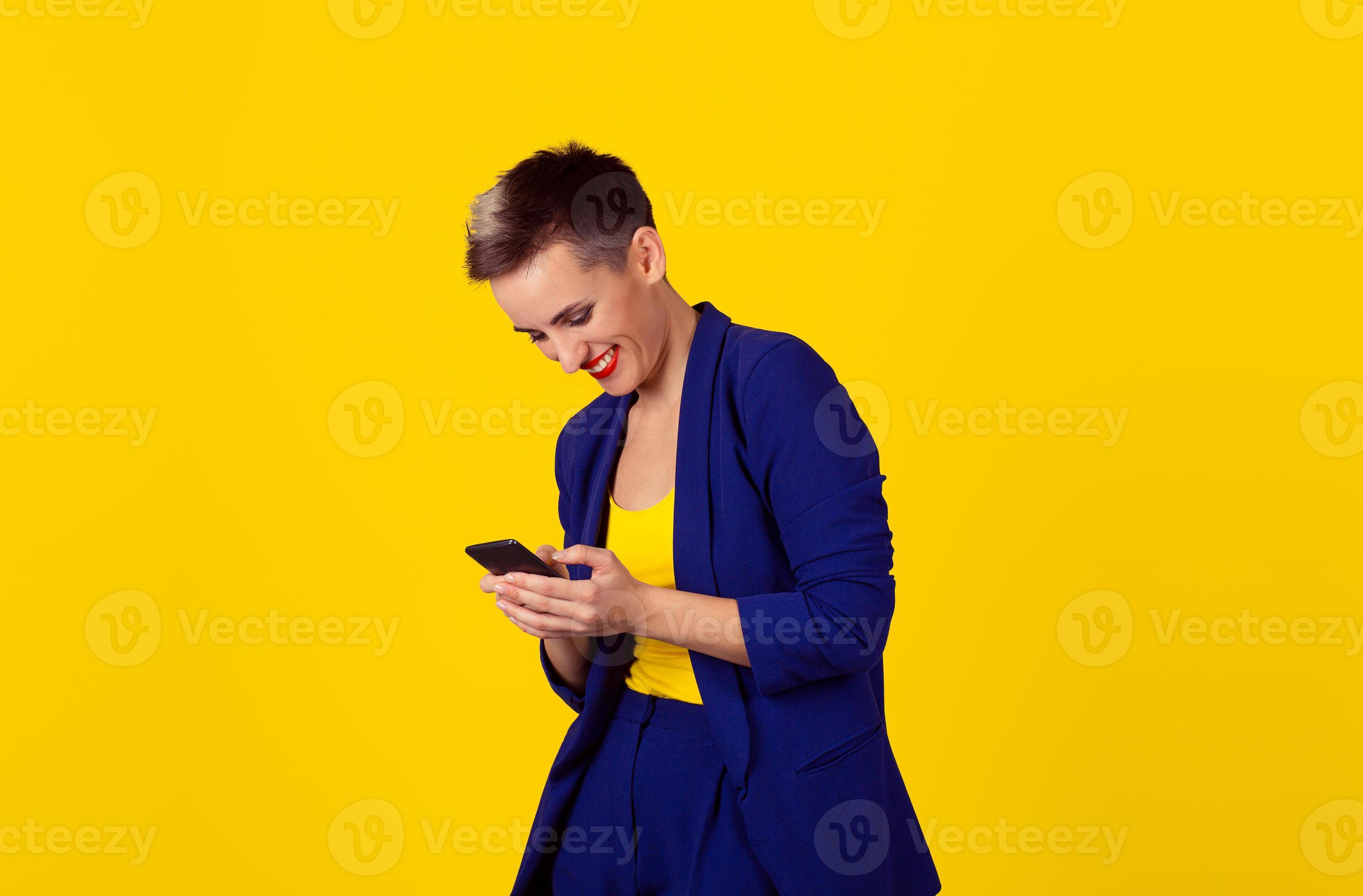 Happy Chat Closeup Portrait Happy Brunette Girl Smiling Looking At Company Cell Phone Isolated Yellow Background Facial Expression Reaction Business Woman Sending Text Message From Her Mobile 1178112 Stock Photo At Vecteezy