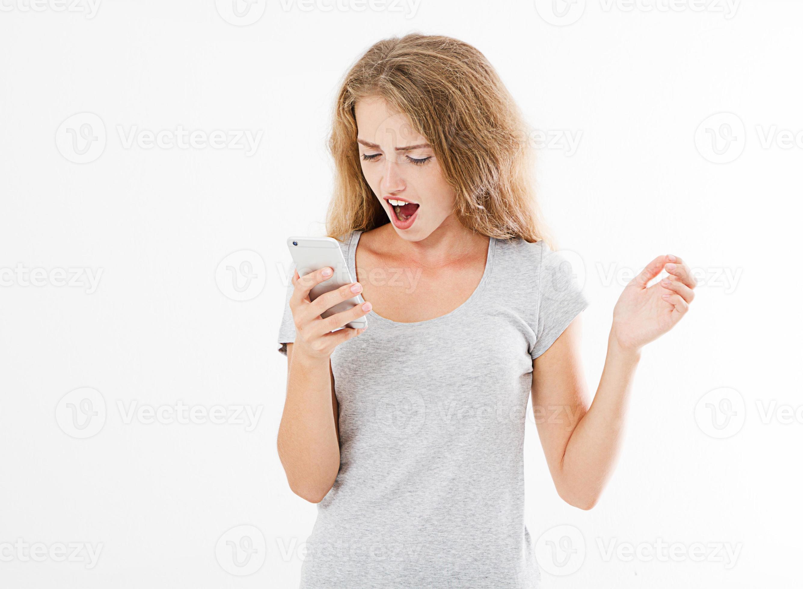 Shocked Look At Phone Portrait Surprised Young Girl Woman Looking At Smartphone Seeing Bad News Or Photos With Stunned Emotion On Face Open Mouth Human Reaction Expression Copy Space 3815108 Stock Photo At Vecteezy
