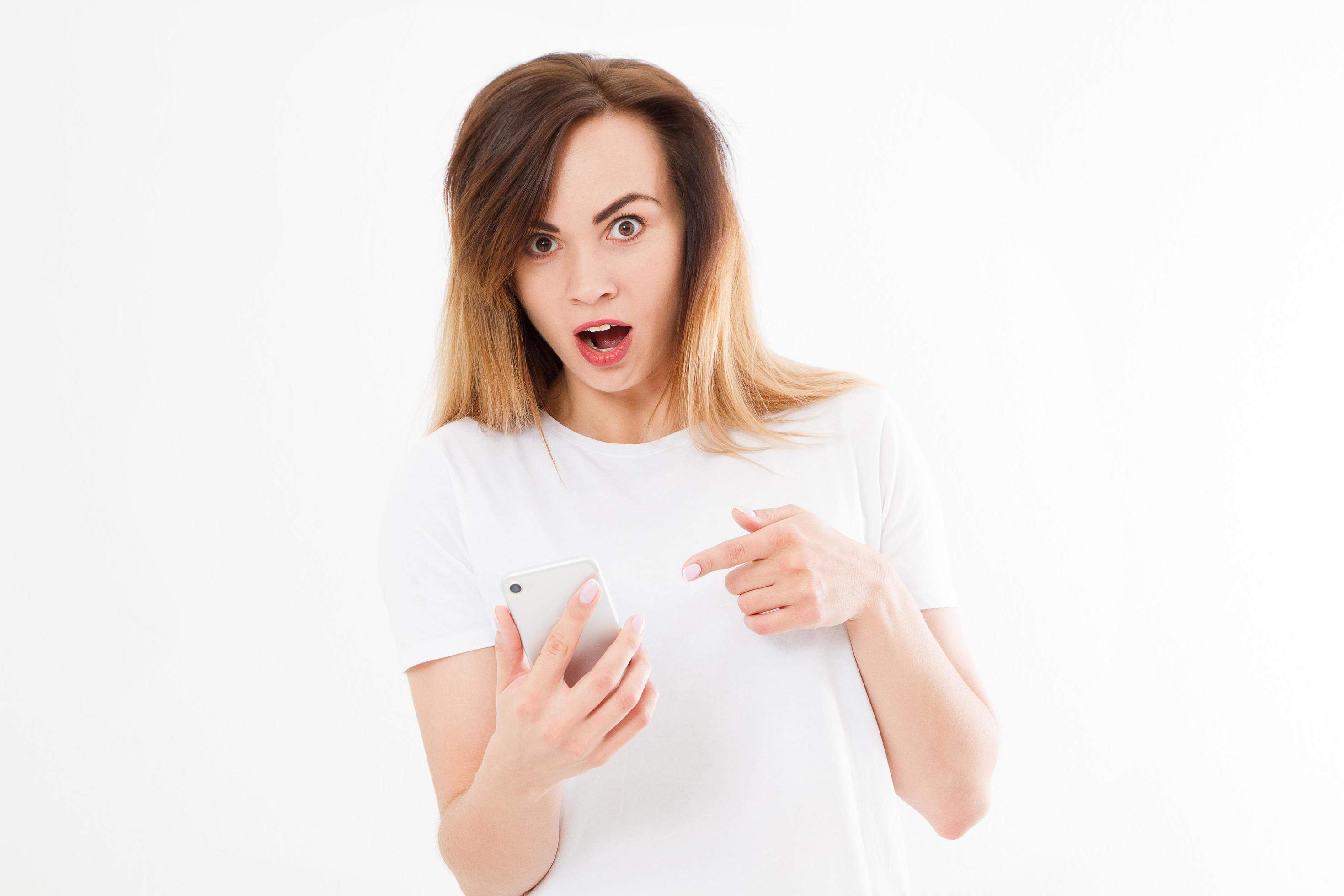 Shocked Look At Phone Portrait Surprised Young Girl Woman Looking At Smartphone Seeing Bad News Or Photos With Stunned Emotion On Face Open Mouth Human Reaction Expression Copy Space 5208458 Stock Photo At Vecteezy